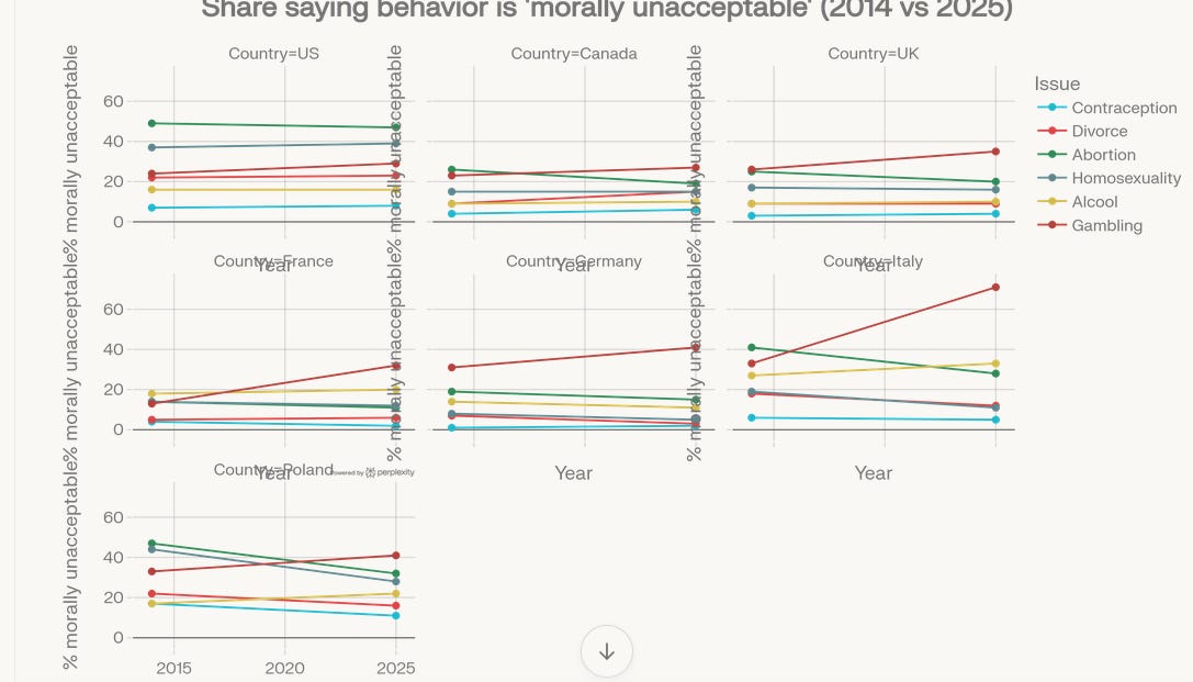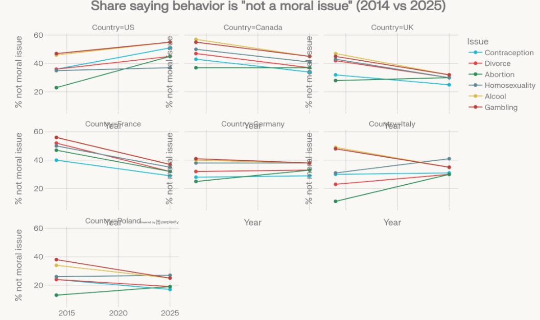 Very short summary: This essay discusses “demoralization,” i.e., the process by which human practices cease to be subject to moral assessment, as a distinct form of moral change particularly relevant to liberal thought. Drawing on Pew Research Center surveys from 2014 and 2025, I analyze the evolution of moral attitudes across seven North American and European countries. The data reveals that the United States has undergone significant demoralization, while France has moved in the opposite direction, with implications for understanding how societies transition between moral frameworks.